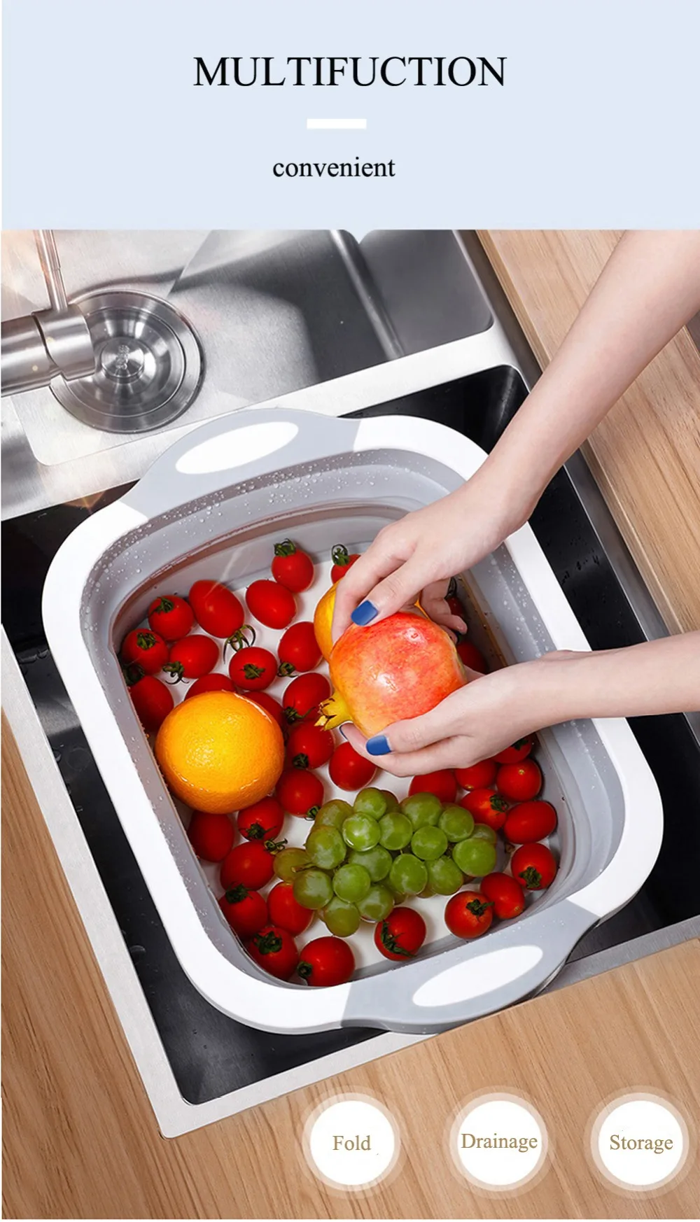 Multi-functions: It can be used as a drain basket, and you can use it to wash and drain your fruits and fresh vegetables. When it is folded into a chopping board, you can use it to cut vegetables, cut fruits, and make delicious food.